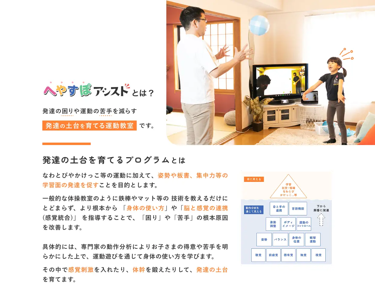 渋谷区に本社を構える「へやすぽアシスト」は、“すべての子どもに運動の楽しさを”をテーマに、運動あそび・発育発達支援プログラムを提供する人気教室ブランド。多くの保護者や教育関係者から支持され、Instagramのフォロワーは約10万人にのぼる。家庭でも取り入れやすい運動メソッドと、子ども一人ひとりに寄り添う姿勢が共感を呼んでいる。療育・発達支援の専門的ノウハウを持つトレーナー陣が揃い、全国はもちろん、世界への展開も視野に入れる注目企業。